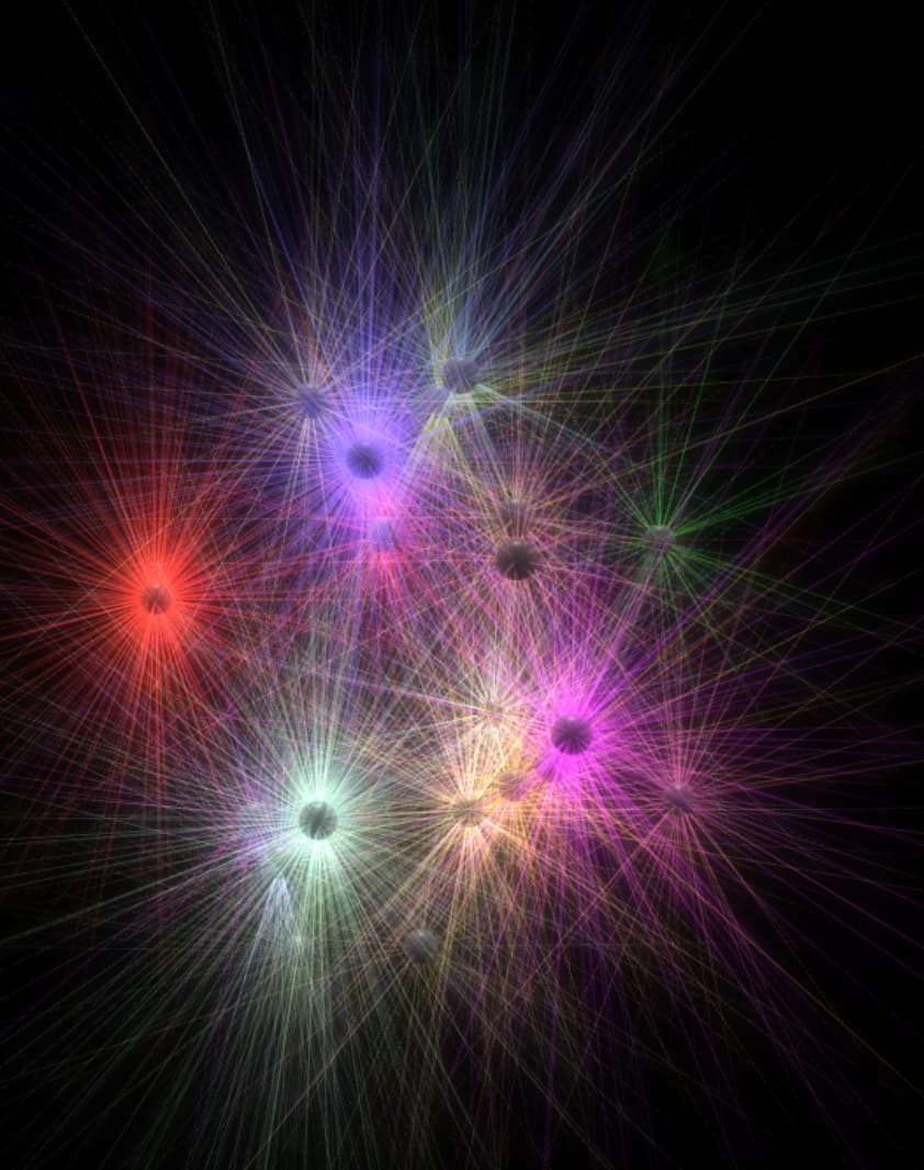 A maze world with flat skyscrapers on a rotating ico sphere with a mystic dust in the air.