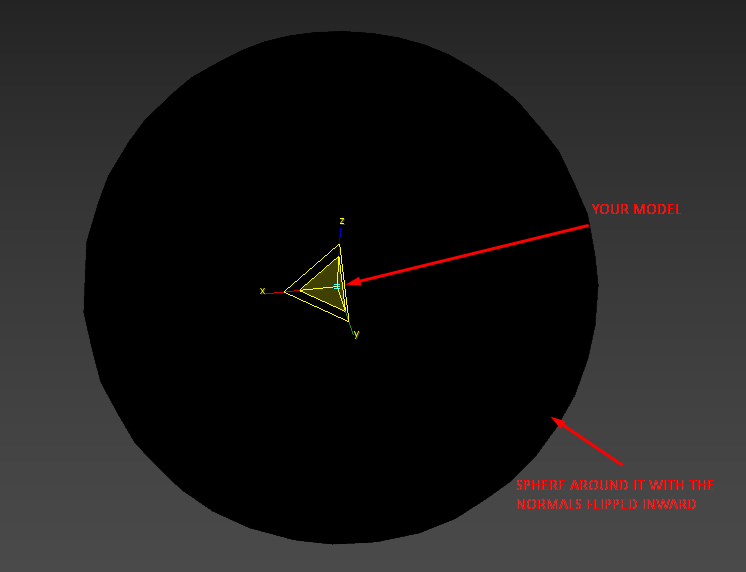 Well in theory, you could create something like a sphere, that will wrap the model in the scene. Then you create a black material for that sphere.