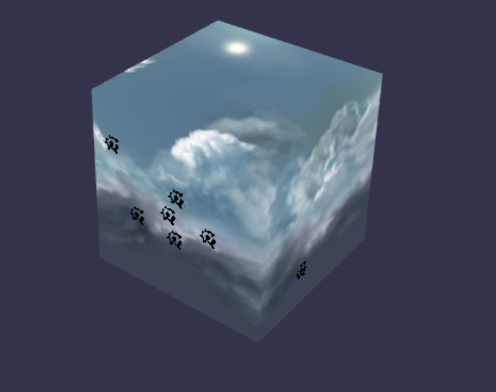 Notice… that when you place a decal in the corner of a cubeMap skybox… the decal can get a bit confused. Decals require fairly complex code, as they are often used to place texture “patches” upon bumpy terrain. Decals attempt to contour themselves to match the mesh they are placed-upon… and this causes the troubles in the corners of the skybox (90-degree contour change in skybox corners).