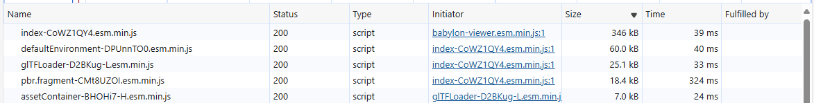 Here you can see the top 5 chunks that make up most of the size. The first one is the main Viewer support, at 346kb. The next one is the default environment (which you can disable or replace with your own environment) which is 60kb. Next is the main glTF loader at 25kb (needed when the Viewer is loading a glTF file, but if you loaded a different file type a different chunk would be downloaded). Then the main support for PBR materials at ~18kb (unless you customize, all glTFs will have this, but other model types may not). Then finally the main AssetContainer