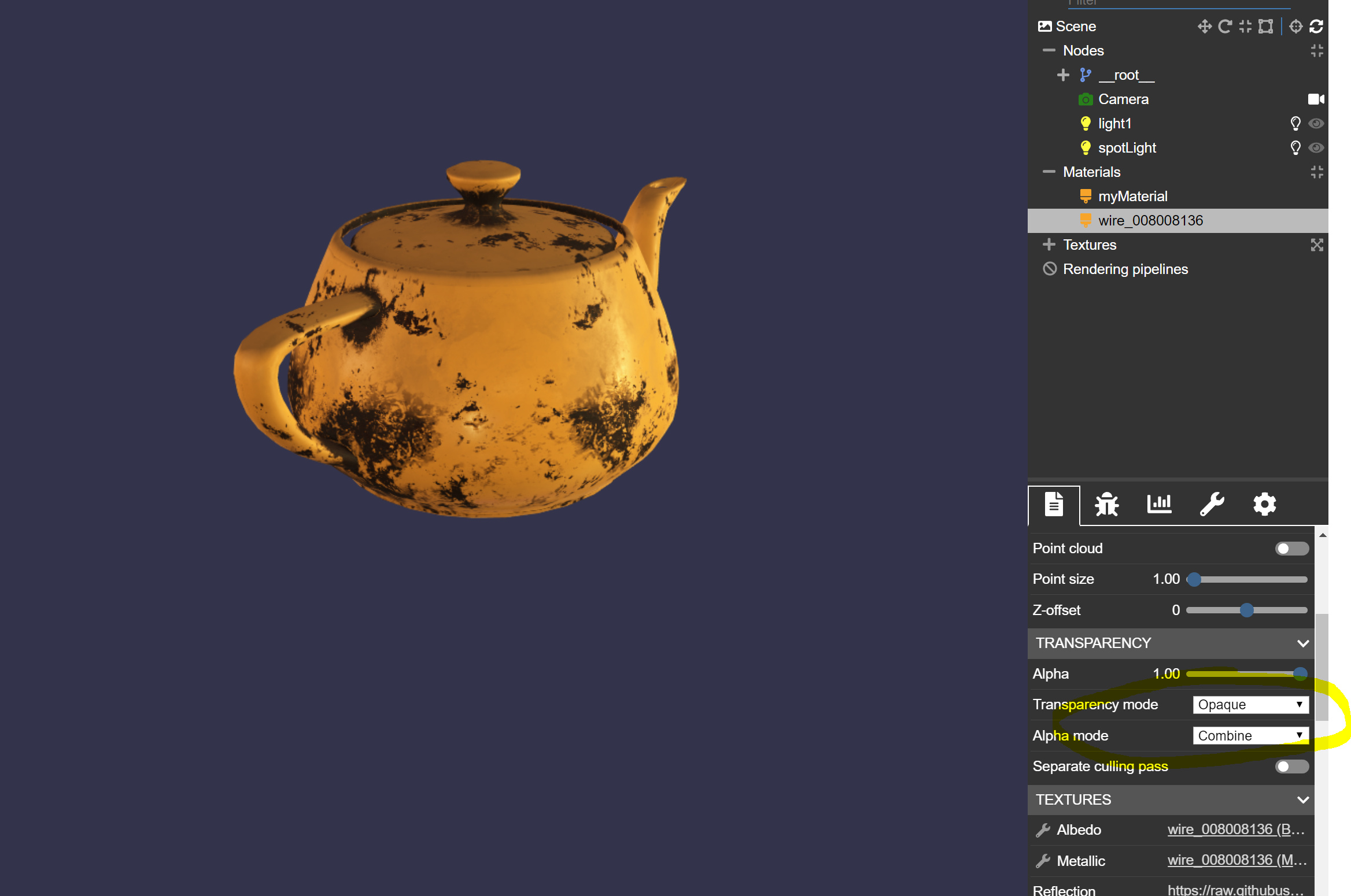 “teapotFromMax.babylon”, scene, function (container) {