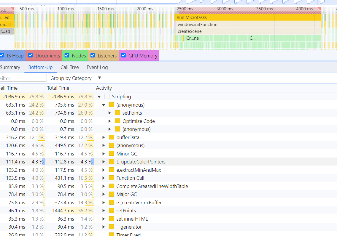 After profiling with chrome devtools, we found that the performance bottleneck is function GreasedLineMesh._setPoints