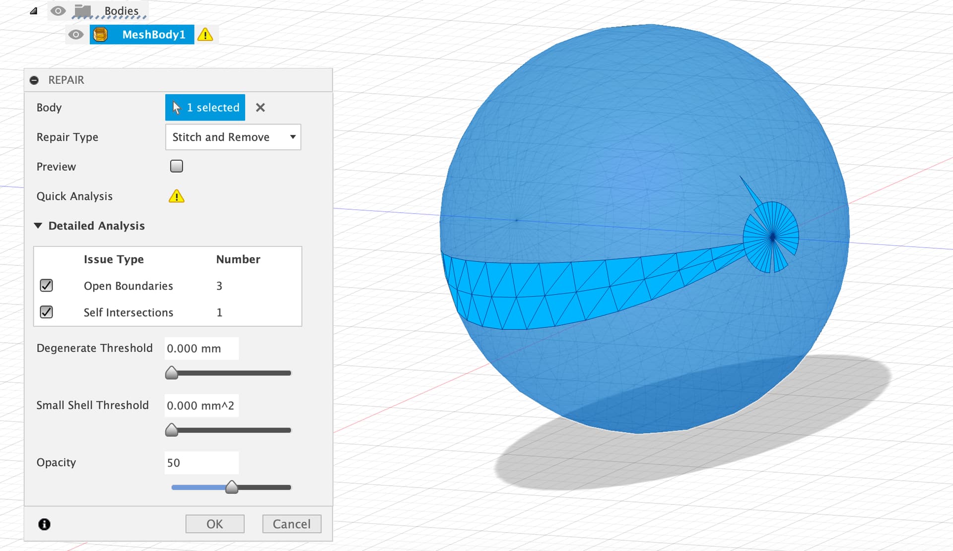 I’ll see if i have time to dig out some old geometry cleaning code later, in the mean time, give me a couple minutes and i’ll share a sphere mesh you can try (i don’t have fusion 360)