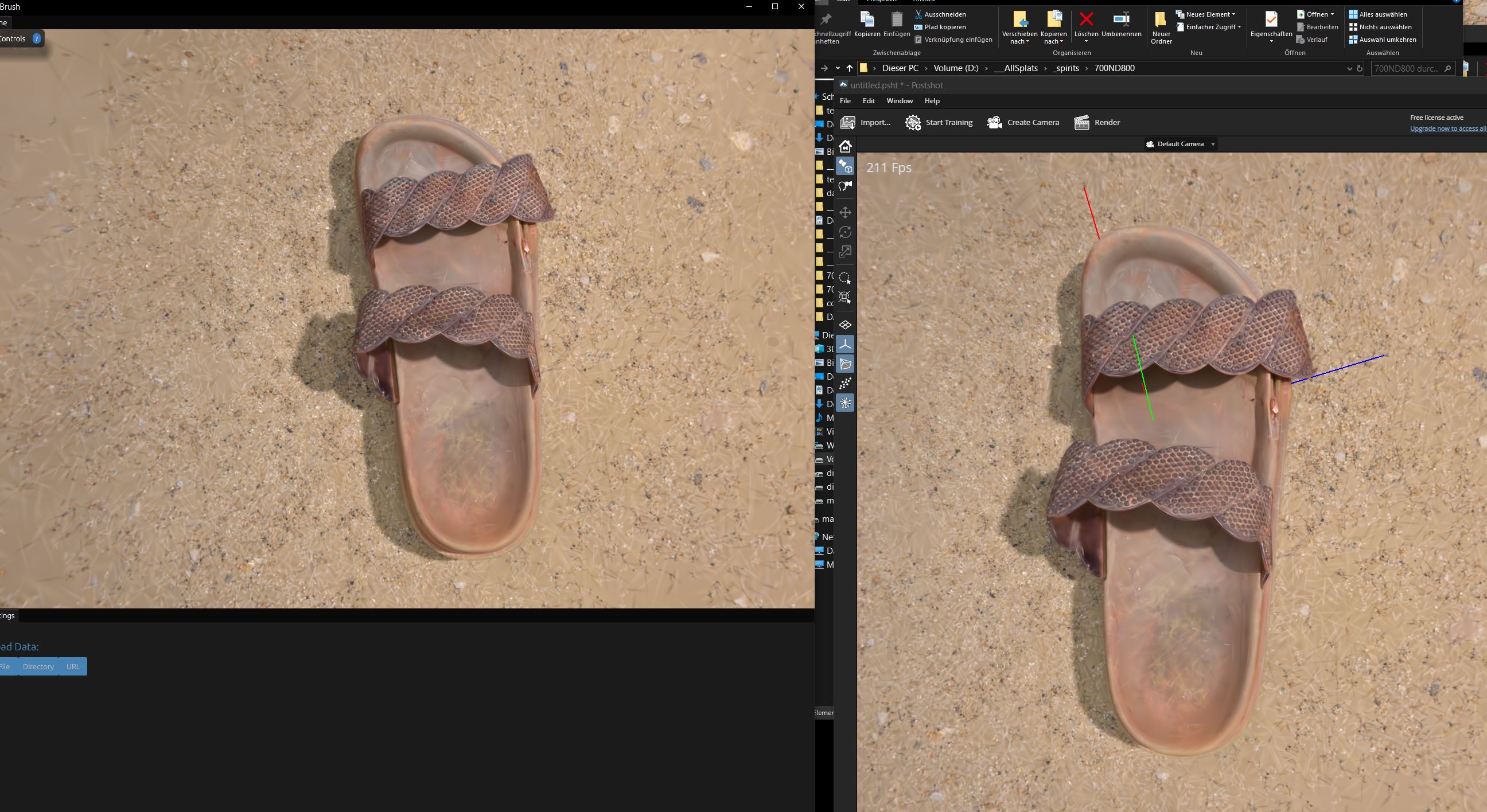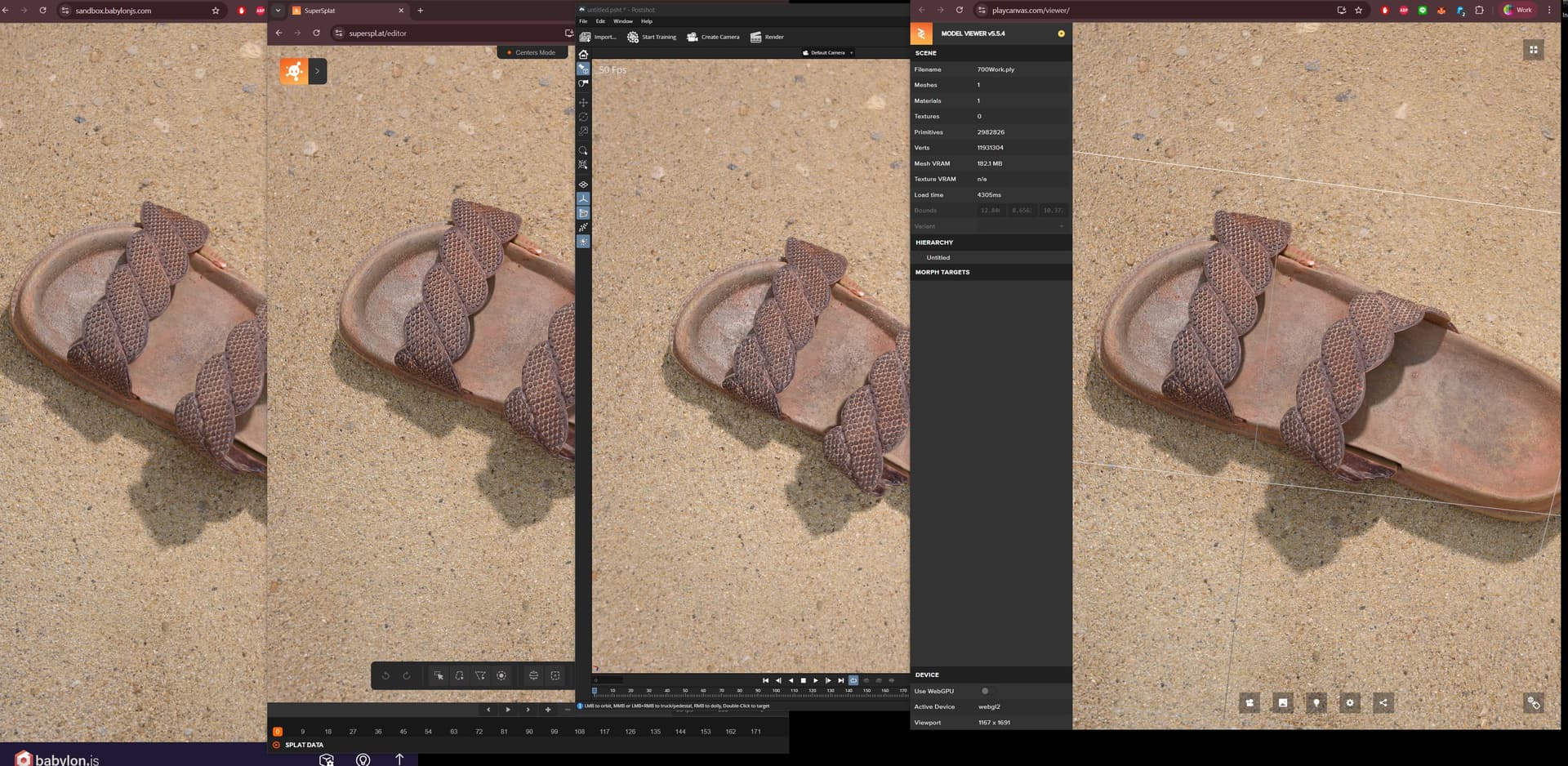 As Werner mentioned we are also chasing a rendering quality issue of PLY files (please see the GScompare1 image). The left hand side image shows the 100k PLY file rendered in Babylon. The most visible difference is in the sand around the shoe (in comparison to the other viewers). With higher splat count density there is no visible difference in the viewers anymore.